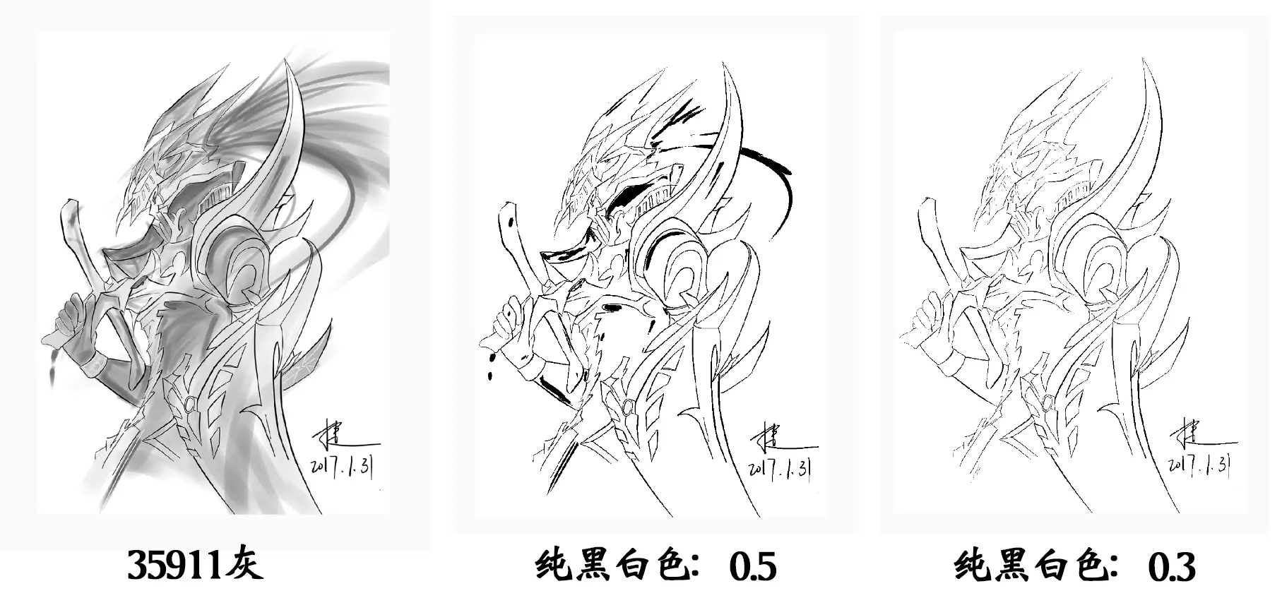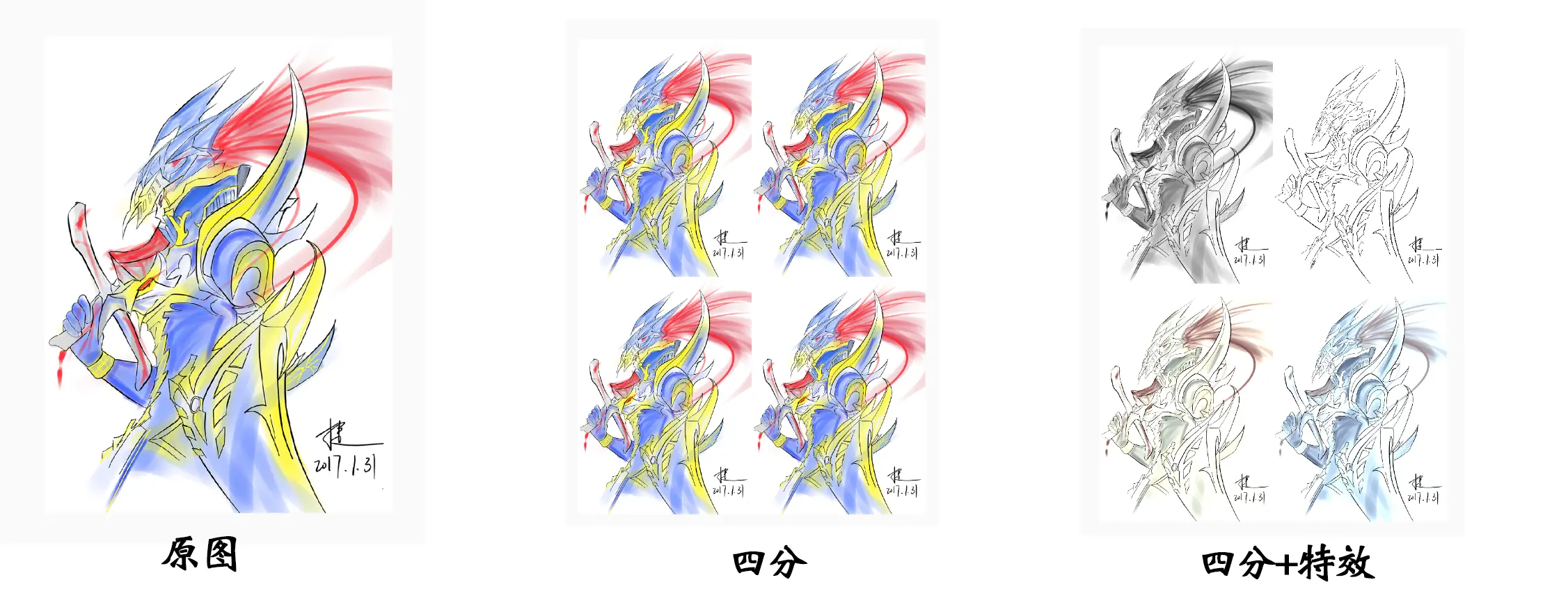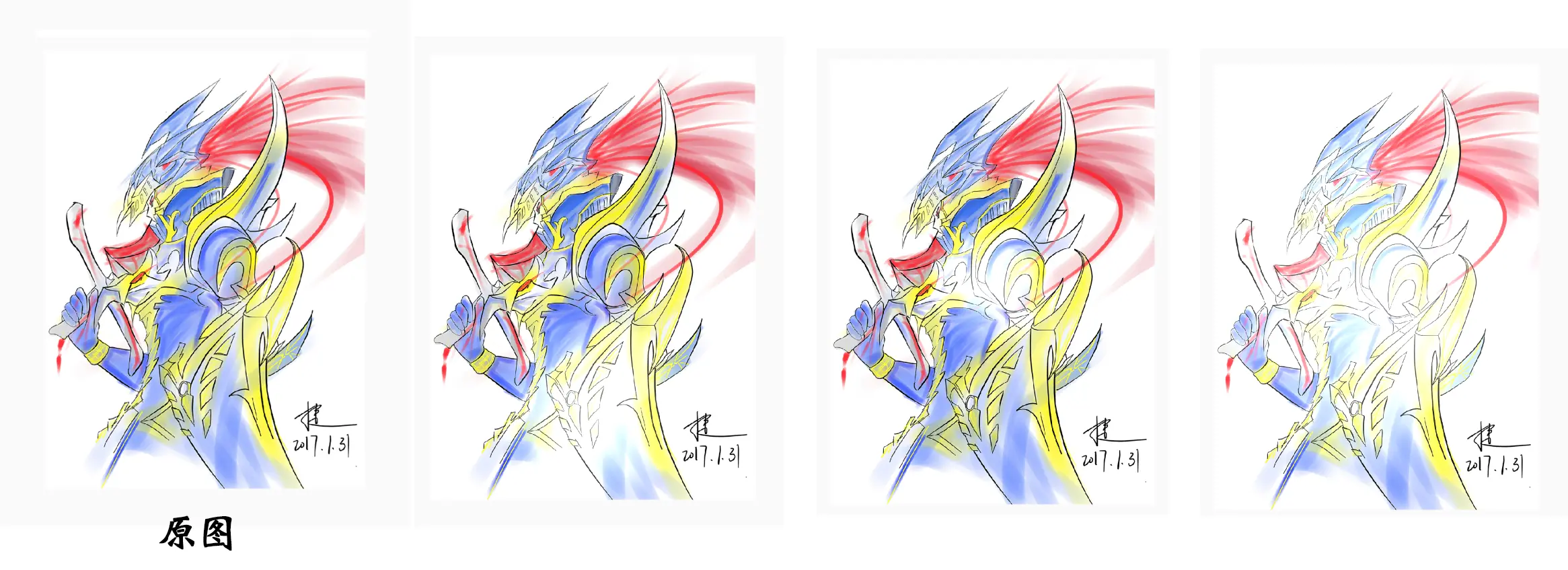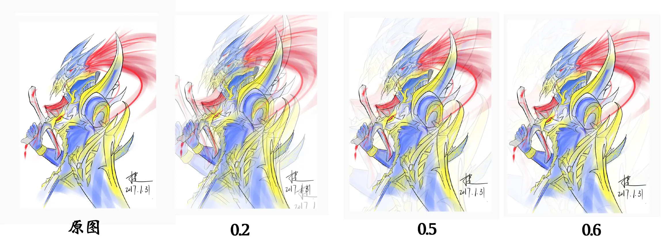 通过阈值的控制,颜色不太复杂的图就可以变成线稿(左三)。