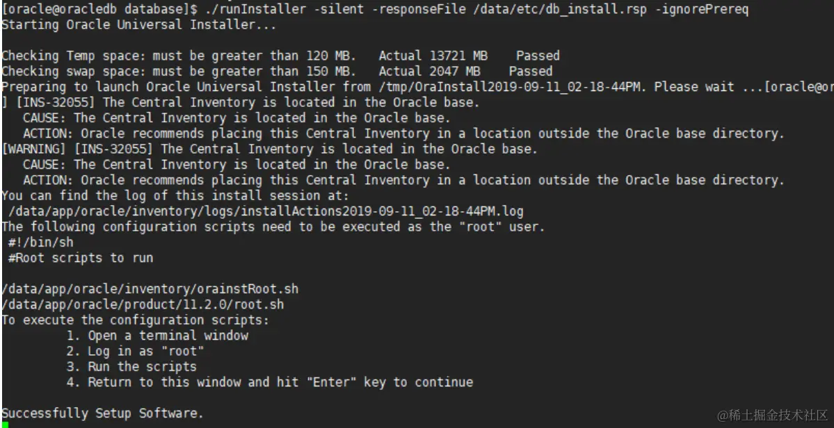 [oracle@oracledb data]$ ./runInstaller -silent -responseFile /data/etc/db_install.rsp -ignorePrereq