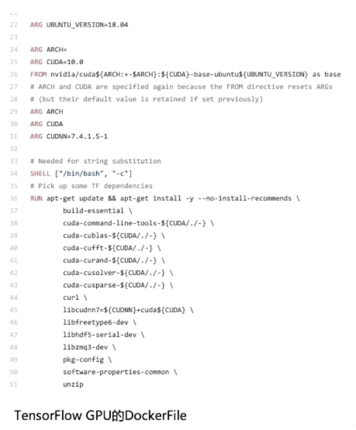 如下图中的 TensorFlow 例子所示,这个就是以 Cuda 镜像为基础,开始构建自己的 GPU 镜像。