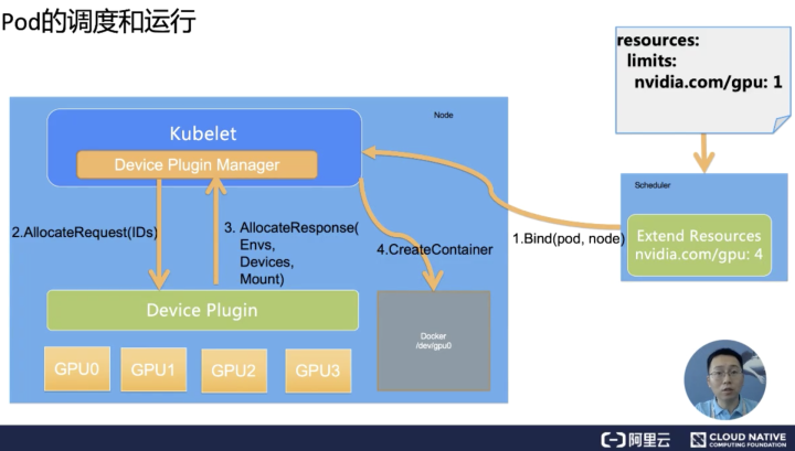 AllocateResponse 中所携带的设备路径和驱动目录信息,一旦返回给 kubelet 之后,kubelet 就会根据这些信息执行为容器分配 GPU 的操作,这样 Docker 会根据 kubelet 的指令去创建容器,而这个容器中就会出现 GPU 设备。并且把它所需要的驱动目录给挂载进来,至此 Kubernetes 为 Pod 分配一个 GPU 的流程就结束了。
