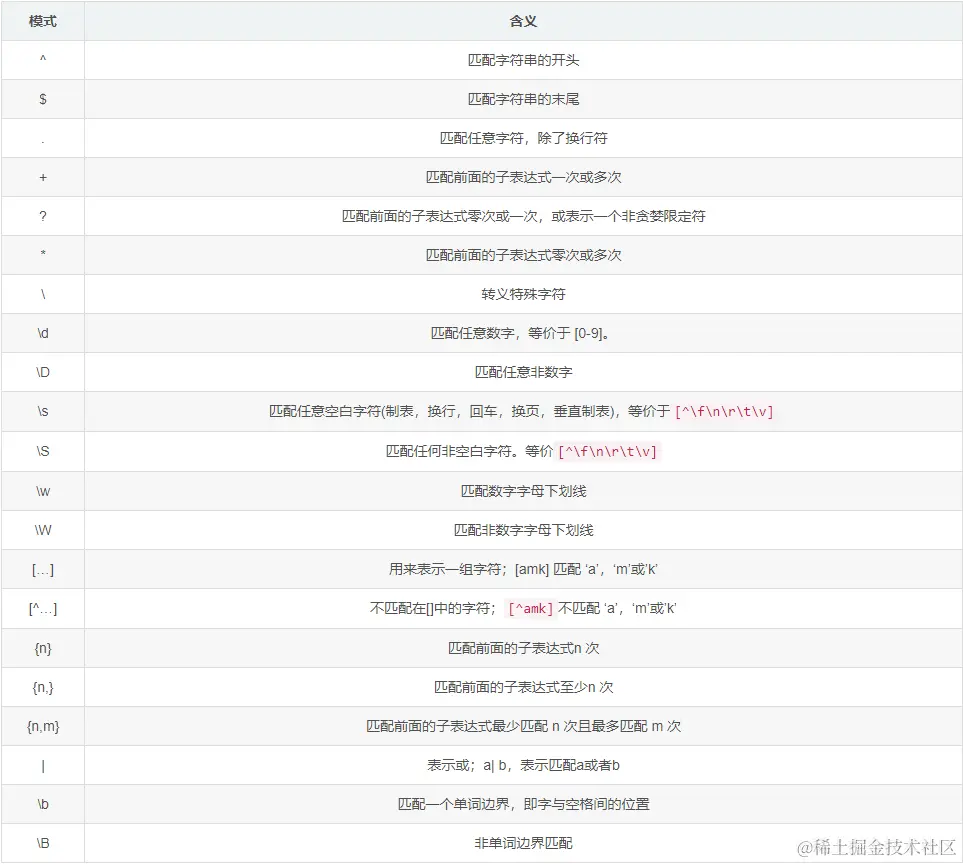 常用的正则表达式模式如下,如果对这些模式有疑惑的可以参照 正则表达式手册 ;手册中还有日常使用的正则示例,比如用户名,密码,邮箱,URL 的匹配模式等;