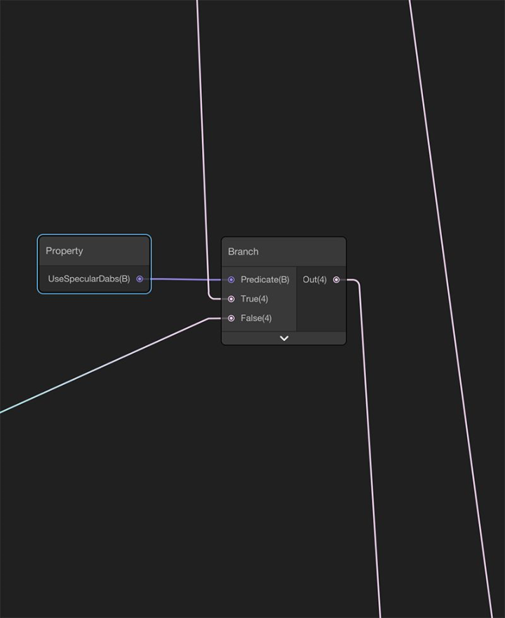然后,我使用这个遮罩来裁剪屏幕空间纹理,创建画笔轻触效果,即上半部分的Paint brush部分;还使用了该遮罩的原本功能,处理头发部分面片形状的镜面效果,即下半部分的Patch部分。为了切换使用这二个功能,我暴露了名为UseSpecularDabs的属性,通过分支节点验证该属性。