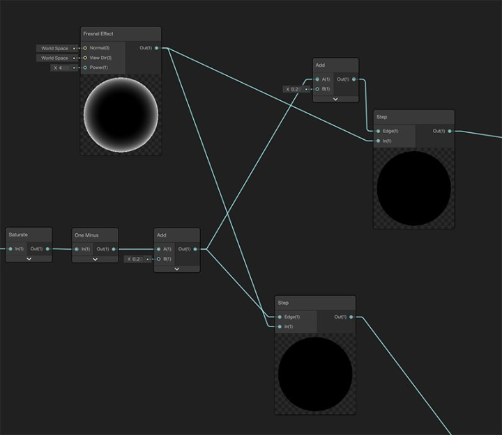 视图顶部的青色方框Rim highlights,在这里,我使用预制的Fresnel Effect节点,但我仍然使用了光线和视线方向的数量积来过滤该节点,这样做会得到只在对象面向光线时出现的边缘。
