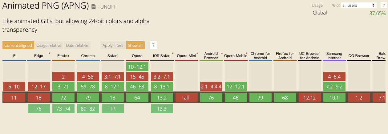 APNG 是 Animated PNG 的简写,是 PNG 格式的一种扩展,可以支持动图。APNG 是向下兼容的,扩展名也是 .png,不支持 APNG 的解码器会表现为 PNG 的形式,即显示 APNG 的第一帧图片。
