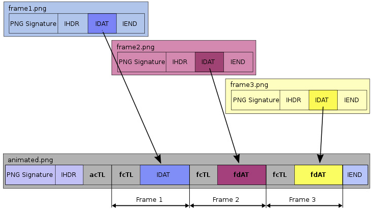 从上图可以看出,APNG 图片格式就是在 PNG 图片基础上增加了 ACTL、FCTL、FDAT 这三个额外的数据块。