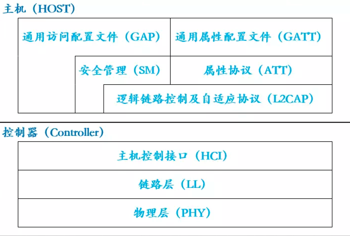 - 主机:硬件的抽象。其中通用访问控制配置文件(GAP)。定义了 BLE 整个通信过程中的流程,负责处理设备访问模式和程序,包括设备发现、建立连接、终止连接等等。GAP 层总是作为下面四种角色之一:(1)广播者:不可连接的广播设备。(2)观察者:扫描设备,但不发起建立连接 (3)外部设备:可连接的广播设备,可以在单个链路层连接中作为从机。(4)集中器:扫描广播设备并发起连接,可以在单链路层连接中作为主机