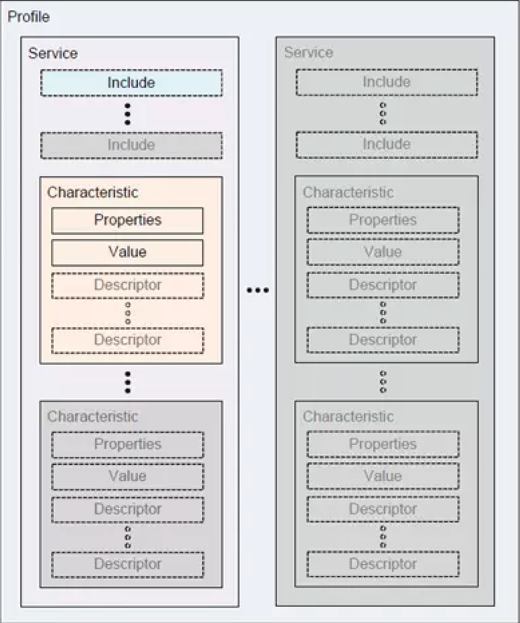 - 服务:服务中包含一系列的特征值。例如,我们可以使用名为 “心率监测器”的服务,其中包括"心率测量"等特征
