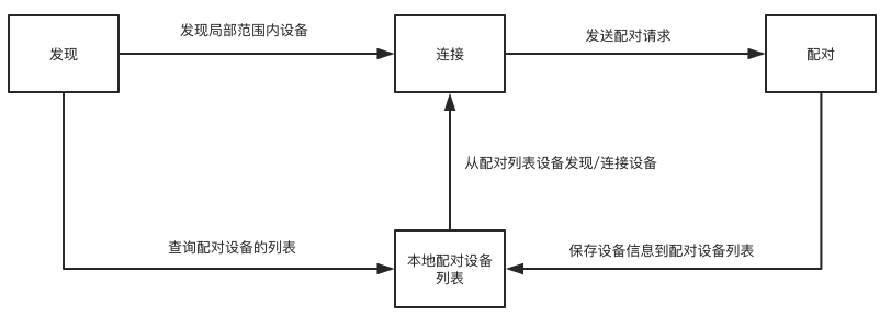 - 配对:意味着两台设备知晓彼此的存在,具有可用于身份验证的共享链路密钥,并且能够与彼此建立加密连接。在执行设备发现之前,有必要先查询已配对设备。
