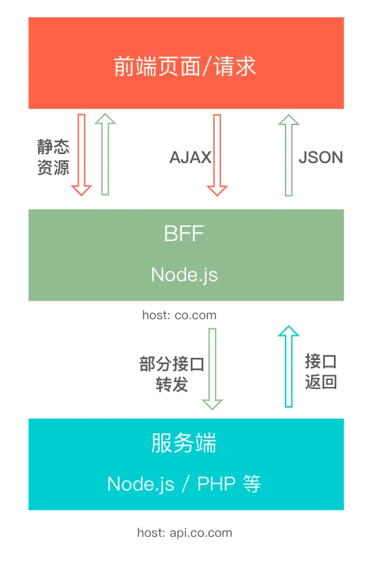 对于 BFF 层,可以通过添加中间件或者其他的方式对于接口进行拦截。如果是静态资源或者是当前服务所提供的接口,则直接处理。如果是调用 api 的接口请求,将其转发到对应的服务即可。