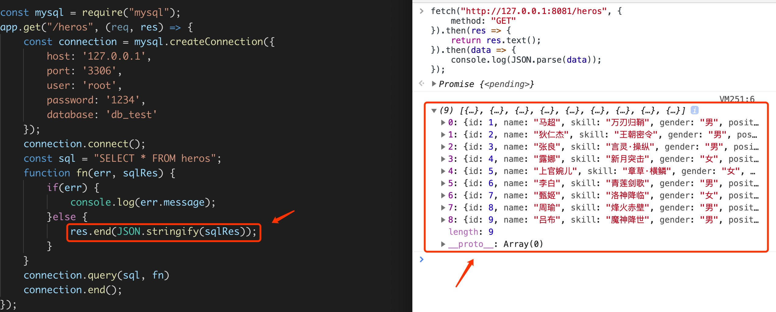 可以看到,都不需要做什么处理,直接把查询结果用 JSON.parse(sqlRes) 转换为字符串就可以发到前端了,前端在转换为对象数组就能直接用了