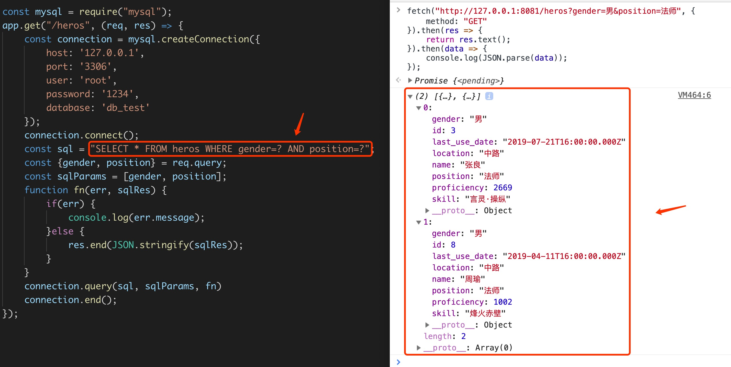 其实这里可以写成预编译的方式,可以避免sql注入的问题,所谓预编译就是说对于原本在sql里面写值换成?占位,然后传入一个数组进去补全这个占位符,也就是connect.query 方法会多一个参数,为一个数组,放入第二个位置。