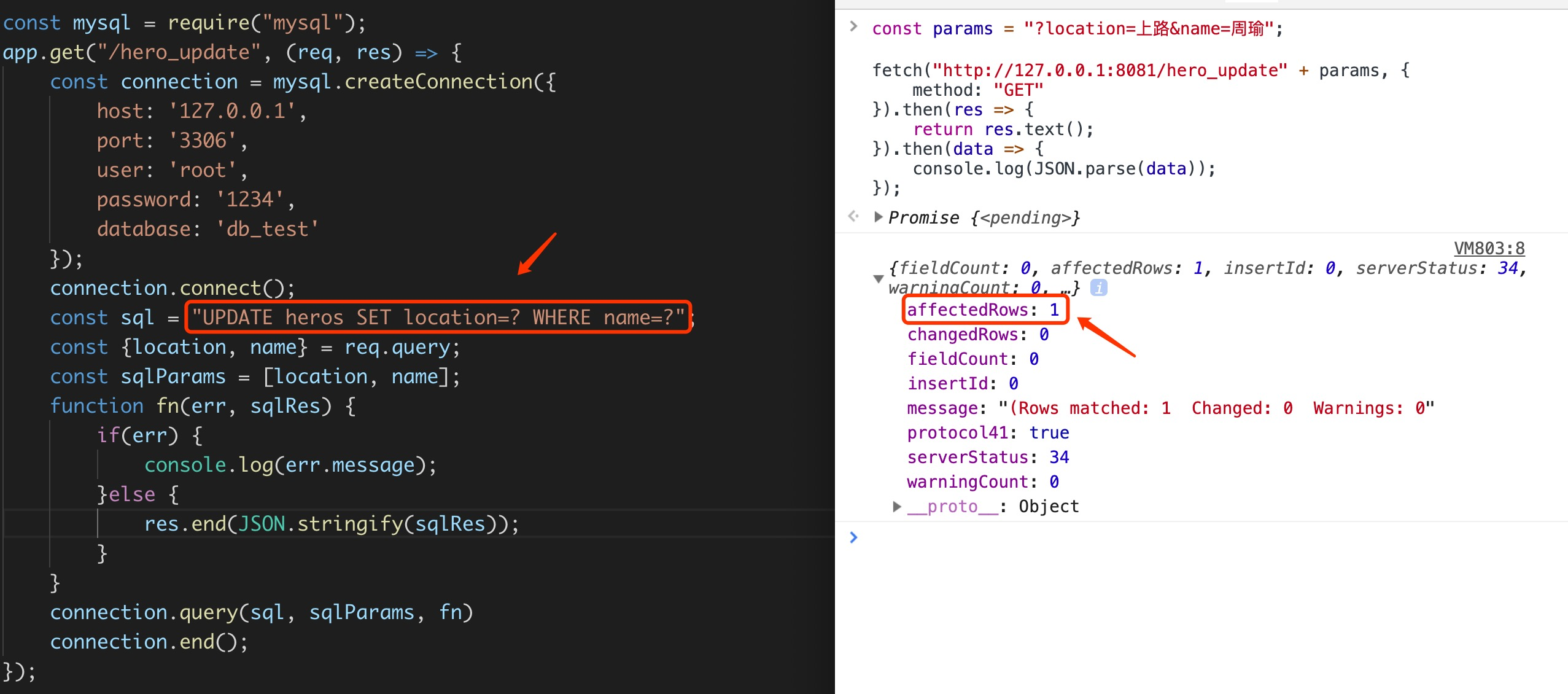 提示:我们可通过影响行数 affectedRows 属性判断是否修改成功。