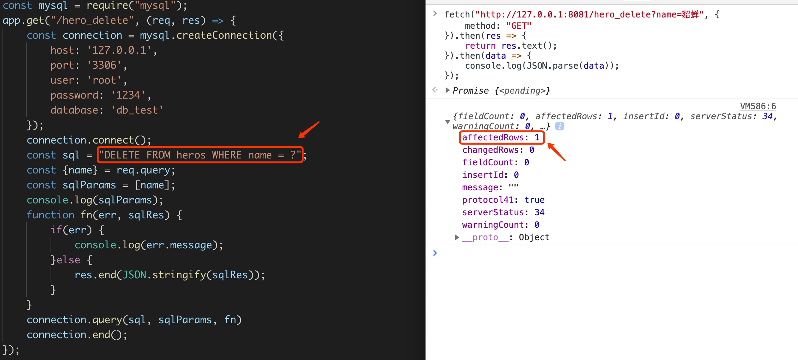 sql:sql指令,如:DELETE FROM heros WHERE name=?sqlParams:sql参数,如:["貂蝉"]function(){}:执行结果回调函数