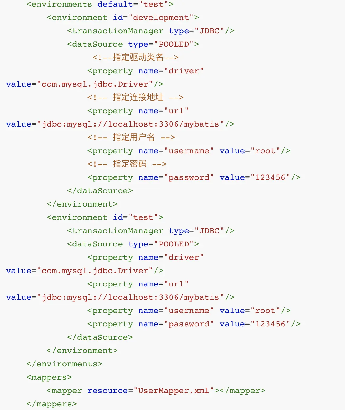 Mybatis其实是可以配置成适应多种环境,但是每个SqlSessionFactory实例只能选择其一,第一步在Mybatis的配置文件里加入environments的标签,标签里加入default参数指向一个环境,默认为环境的id;第二步在environment标签里配置一个具体的环境,标签里的id为一个具体环境的id;第三步添加transactionManager标签指定事务的类型;第四步使用dataSource标签配置数据源,标签里type属性指定数据源类型。下面来个实例图。
