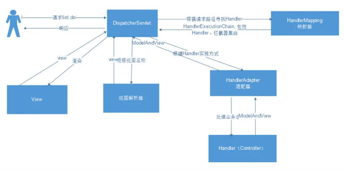 以前我们在写代码的时候,虽然有了mvc的模式分出三层架构,让我们能够更加清晰和方便实现业务。但还有在Servlet里存在获取请求参数、页面跳转代码冗余等一些问题,这个时候就有一些公司针对mvc框架的优化,推出一些框架,比如struts、WebWork、Spring MVC等。我个人觉得Spring MVC在数据绑定、视图解析、本地化处理及静态资源处理上都有许多不俗的表现,感觉他在很多方面都超越了struts和WebWork。他通过一套MVC的注解,让POJO成为处理请求的控制器,无需实现任何接口并支持Rest风格的URL请求。他是围绕DispatcherServlet这个核心展开的,让他负责截获请求并分派给相应的处理器处理。在面试中我们经常被问到Spring MVC的执行流程,用下图来表示他的整体结构。