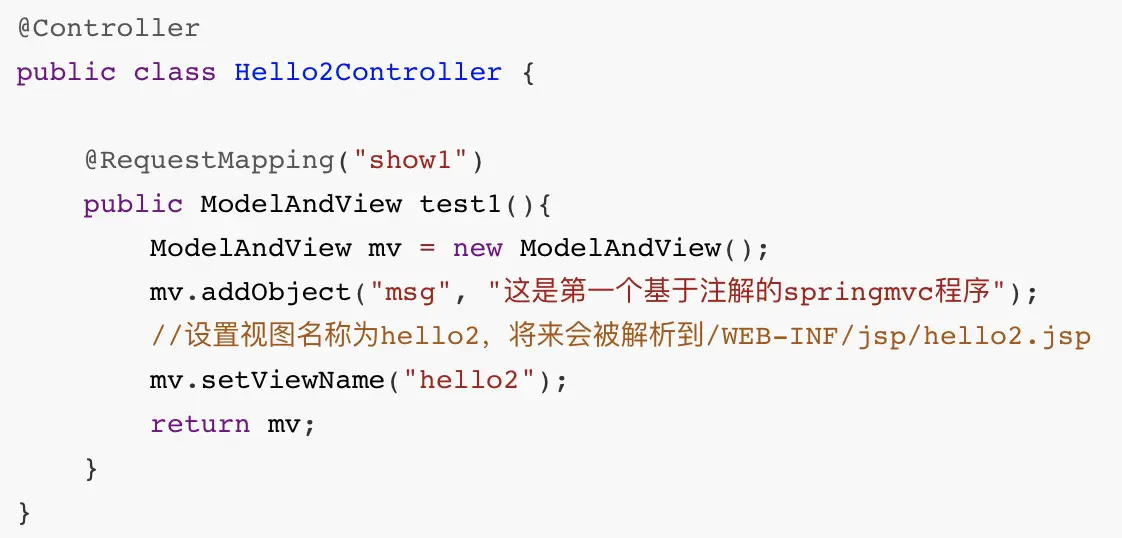第一步创建一个Controller类,在类上加上@Controller,类中的方法上面写@RequestMapping注解表示请求的路径,也可在类上面加上这个注解;方法的返回值为ModelAndView,类中创建一个ModelAndView,并注入参数,最后返回mv;下面有一个实例图展示。