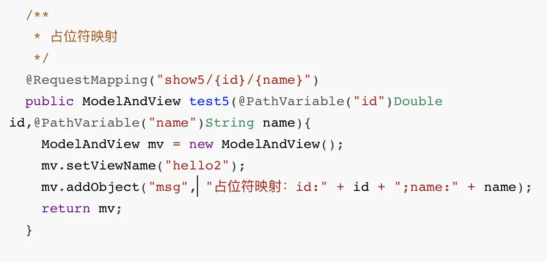 接收请求路径中占位符的值,使用@PathVariable注解标志映射关系,使用ModelAndView方法里的addObject方法,前面加“msg”后面加上"占位符映射:"和占位符的参数就能接受。举个实例图。
