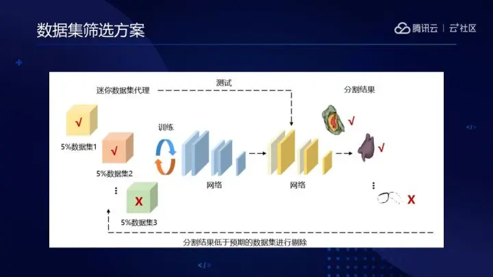 MedicalNet 开发团队主要通过两个方案来解决这些难题。首先是数据集筛选方案,主要目的是找出具备共通知识的数据集。具体做法如下:从每种场景的数据集中挑选少量数据,形成迷你数据集代理,通过代理快速训练成小网络,最后根据迷你数据集分割预测结果的好坏判断哪些数据集能够保留下来。