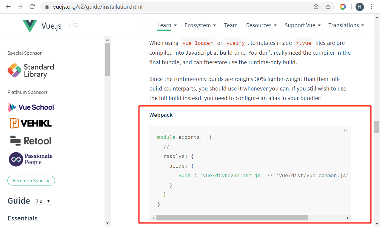 这就要求我们在webpack.config.js中配置别名来指定其中一个为我们要使用的vue,通常指定使用vue.esm.js。esm是ECMAScript module的缩写,即ES模块版。