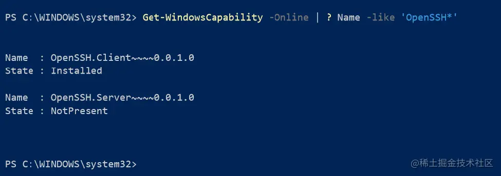 Get-WindowsCapability -Online | ? Name -like 'OpenSSH*'