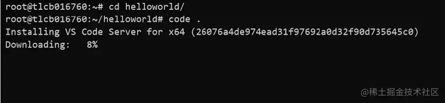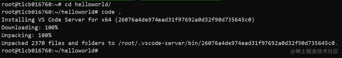 在WSL终端中创建一个helloworld空文件夹,在该文件夹下键入code .启动Visual Studio Code。