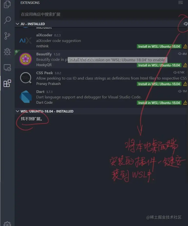 你看到的第一件事是有关“正在安装VS Code Server”的消息(26076a4de…数字是与刚安装的客户端工具匹配的VS Code Server的版本)。 VS Code正在Linux端安装一台小型服务器,然后桌面端VS Code将与之对话。 然后,该服务器将在WSL中安装并托管扩展,以便它们在WSL中安装的工具和框架的上下文中运行。换句话说,你在本地机器上安装的语言扩展,在WSL中不能使用。插件面板也体现地很清楚。