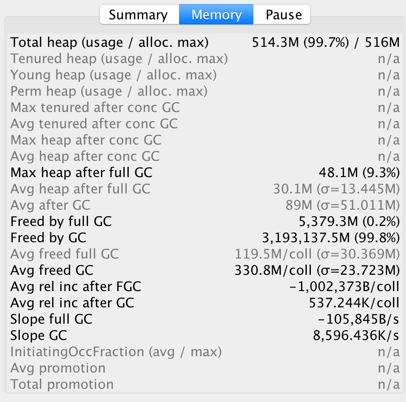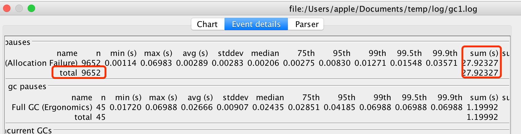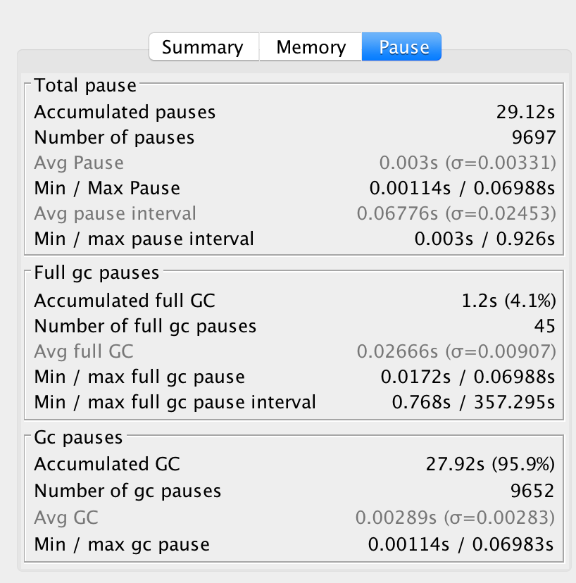 从图中,我们知道了总的停顿时间是29.1s, 次数是9千多次,平均数据都在图中看出。