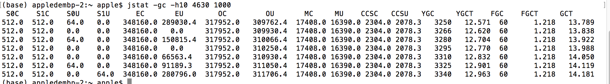 从实时的数据来看: gc的总时间13.789s-14.181s,期间运行了7次,平均有0.056s。而ygc的次数有:3340-3250 = 90, 时间:12.963-12.571=0.392s 那么平均YGC时间=0.004,我们现在来看下非默认配置情况: