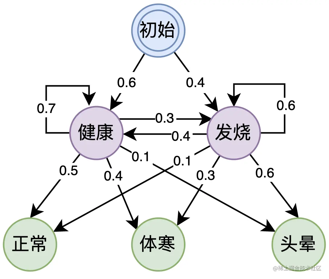 - 终止:找出最终时刻数组中的最大概率,以及相应的结尾状态