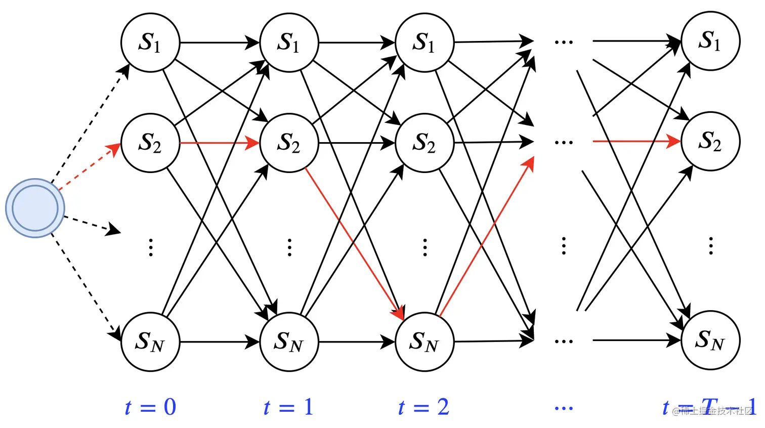 - 初始化:时初始最优路径的备选由个状态组成,它们的前驱为空: