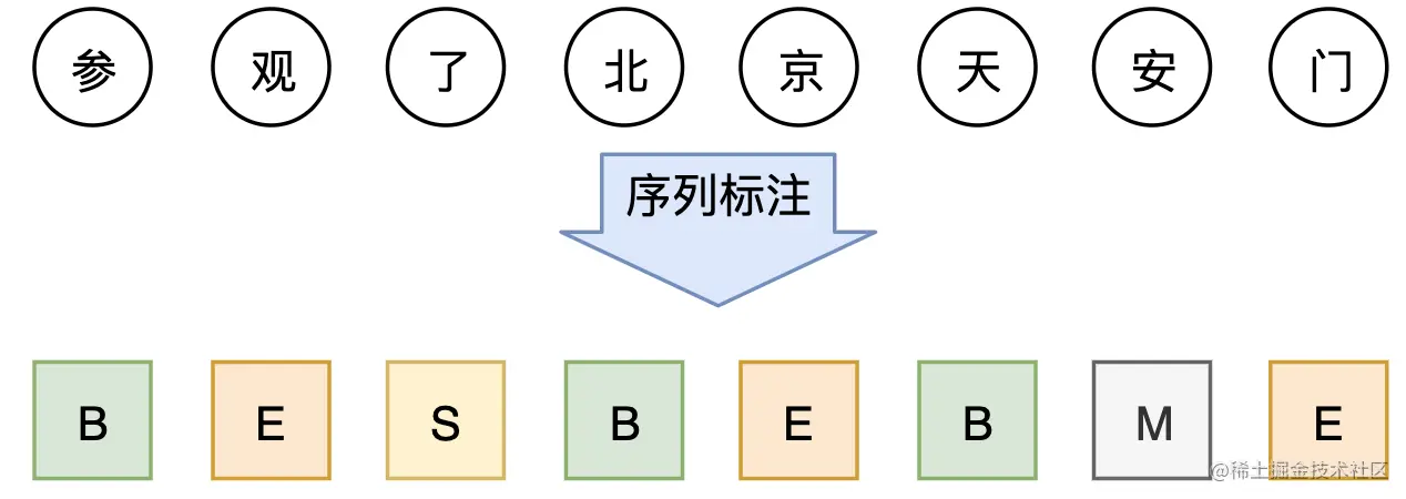 标注后,按照最近的两个BE标签对应区间合并为一个词,S标签对应单字词语,按顺序输出即为分词过程。