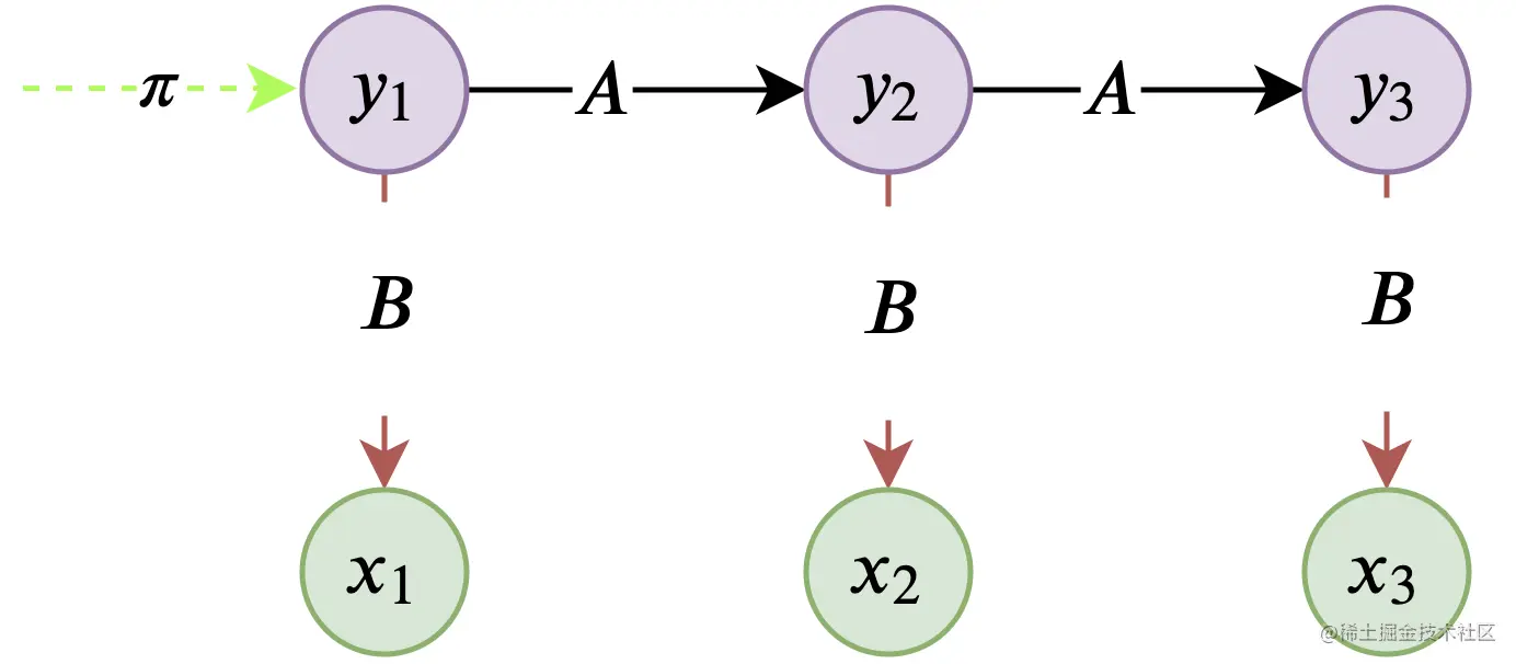 状态与观测之间的依赖关系确定以后,隐马尔科夫模型利用三个要素来模拟时序序列的发生过程: