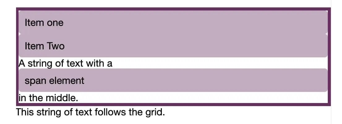 下面的示例有两个块级元素,在字符串中添加一个包含在span中的文字字符串。我们最终得到5个网格项: