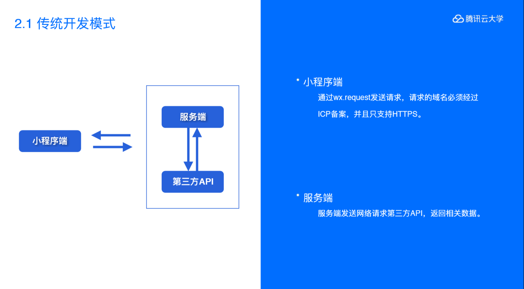 传统开发模式,在小程序端,通过wx.request发送请求,请求的域名必须经过ICP备案,并且只支持HTTPS,服务端在接受到小程序端的请求后,将会发送网络请求给第三方API,返回相关数据给小程序端。