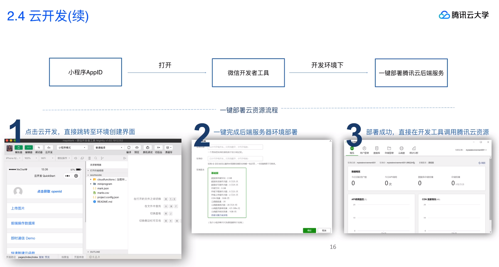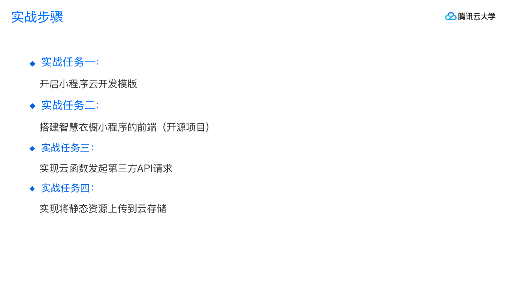 本期腾讯云大学大咖分享邀请陈碧棋老师,将会演示如何使用云开发快速为小程序加入请求第三方API能力,在实战环节会带领大家搭建一个具备当天当地实时推荐衣着小程序。