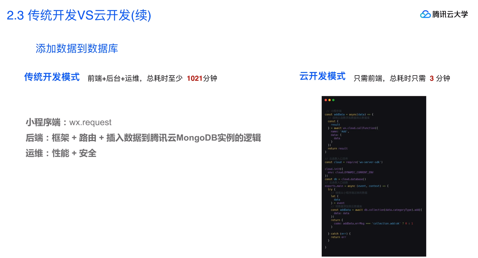 添加数据到数据库功能,在传统开发模式中,需要在小程序端使用wx.request API,后端也要搭建框架、路由,实现插入数据到腾讯云MongoDB实例的逻辑,在运维上还需考虑性能和安全方面的问题。传统开发模式下,需要前端、后端和运维岗位进行配合,在该功能上总耗时至少1021分钟。在云开发模式中,使用云函数实现插入数据到运输局库中,仅需要在小程序端使用wx.cloud.Functon API去调用云函数,将需要添加的数据传递给云函数,即可完成添加,整个过程只需3分钟,也只需要一名前端即可完成该功能点。