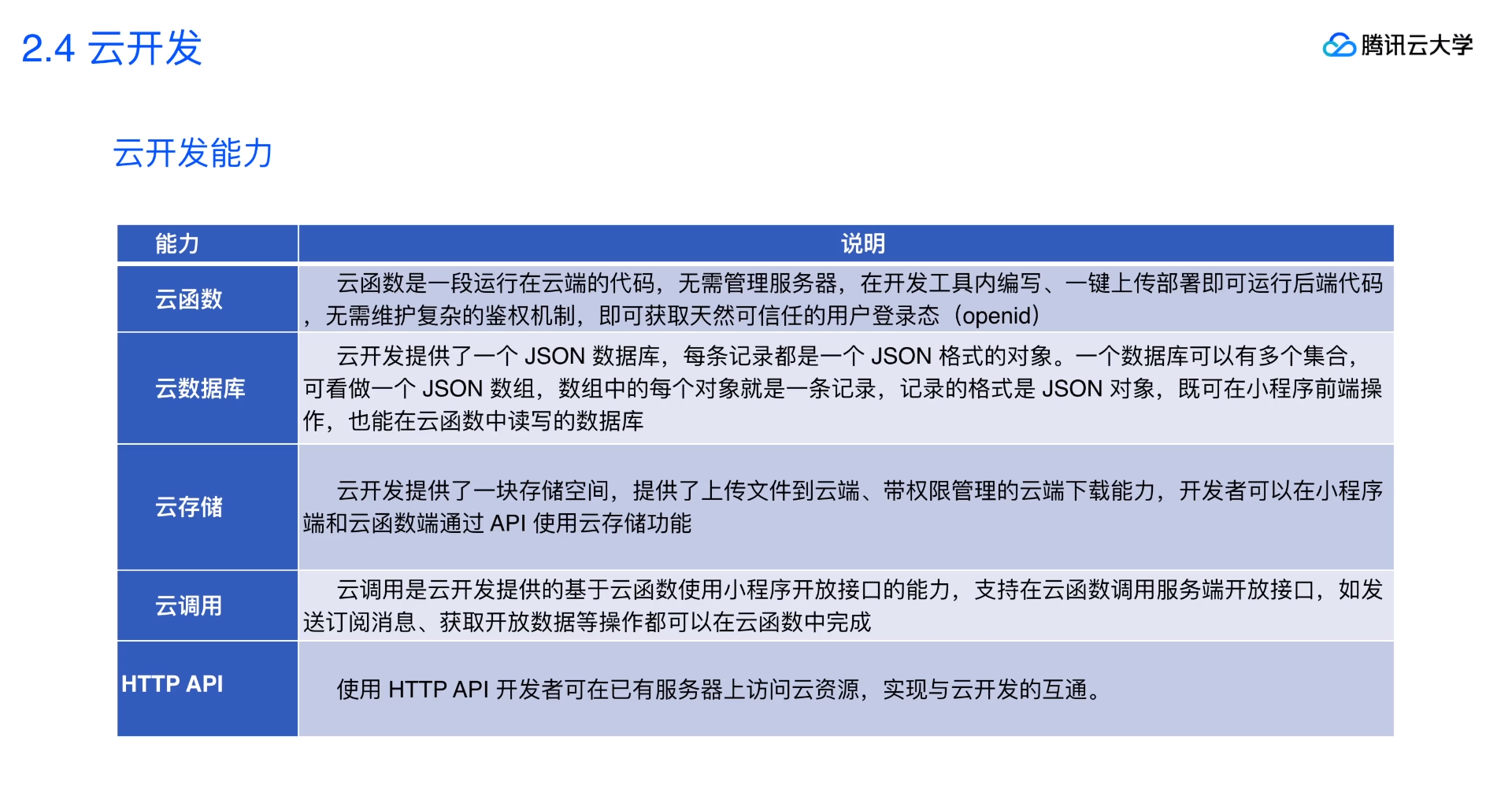 下面介绍云开发的几大能力,有云函数、云数据库、云存储、云调用、HTTP API。