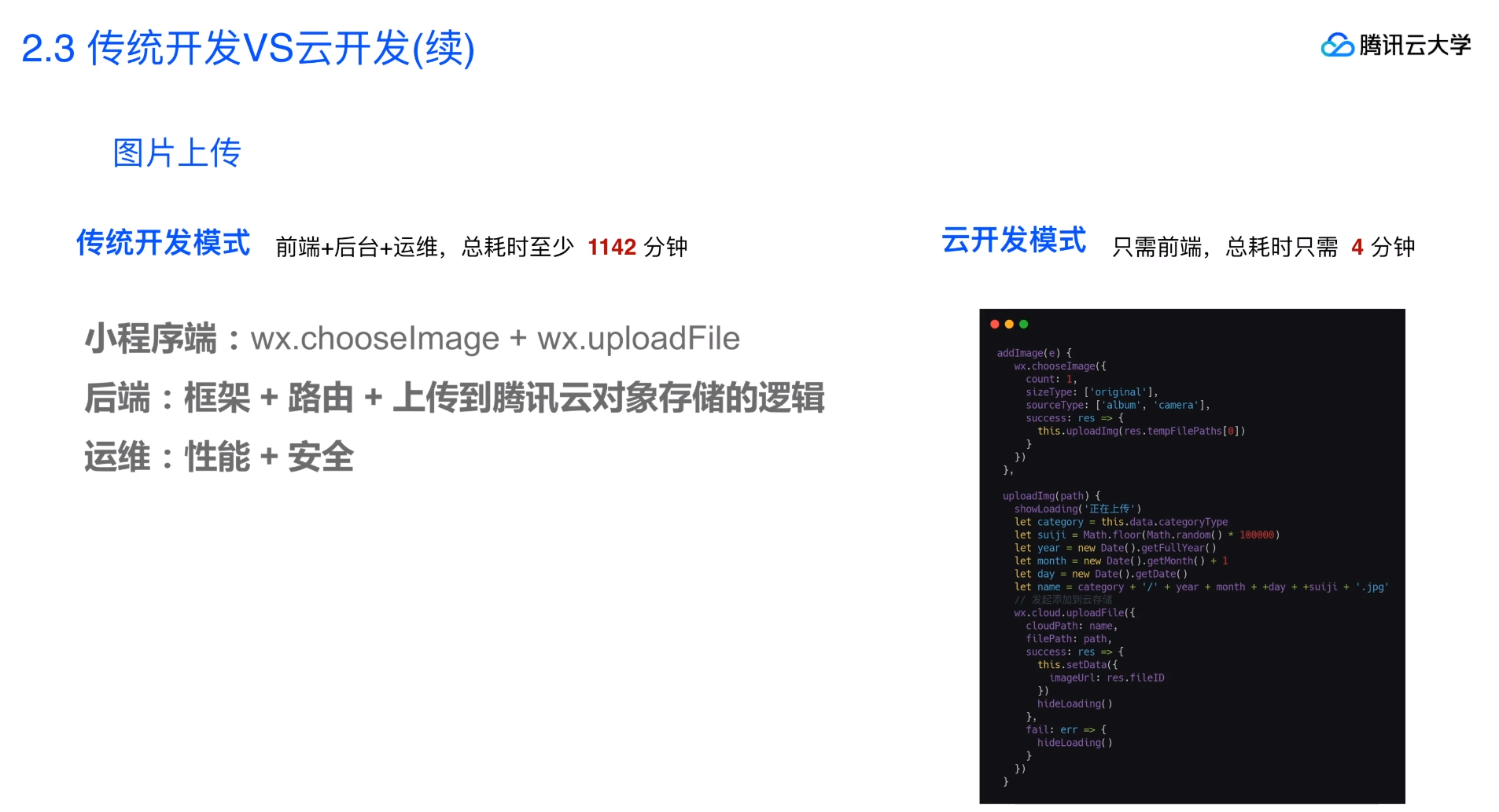 在智慧衣橱小程序中,使用到图片上传到云端对象存储以及插入到远端数据库这两个功能点。以图片上传功能,具体对比云开发和传统开发,在传统开发模式中需要在小程序端使用选择图片API和上传文件API,在后端需要搭建框架、路由和上传到腾讯云对象存储的逻辑,在运维上还需考虑性能和安全方面的问题,需要前端、后台和运维进行配合,在该功能上总耗时至少1142分钟。在云开发模式下,只需要在小程序端使用图片API结合云开发封装的wx.cloud.uploadFile的API,指定存储路径以及文件路径即可完成图片上传的,整个过程耗时只需4分钟,并且只需要前端即可完成。