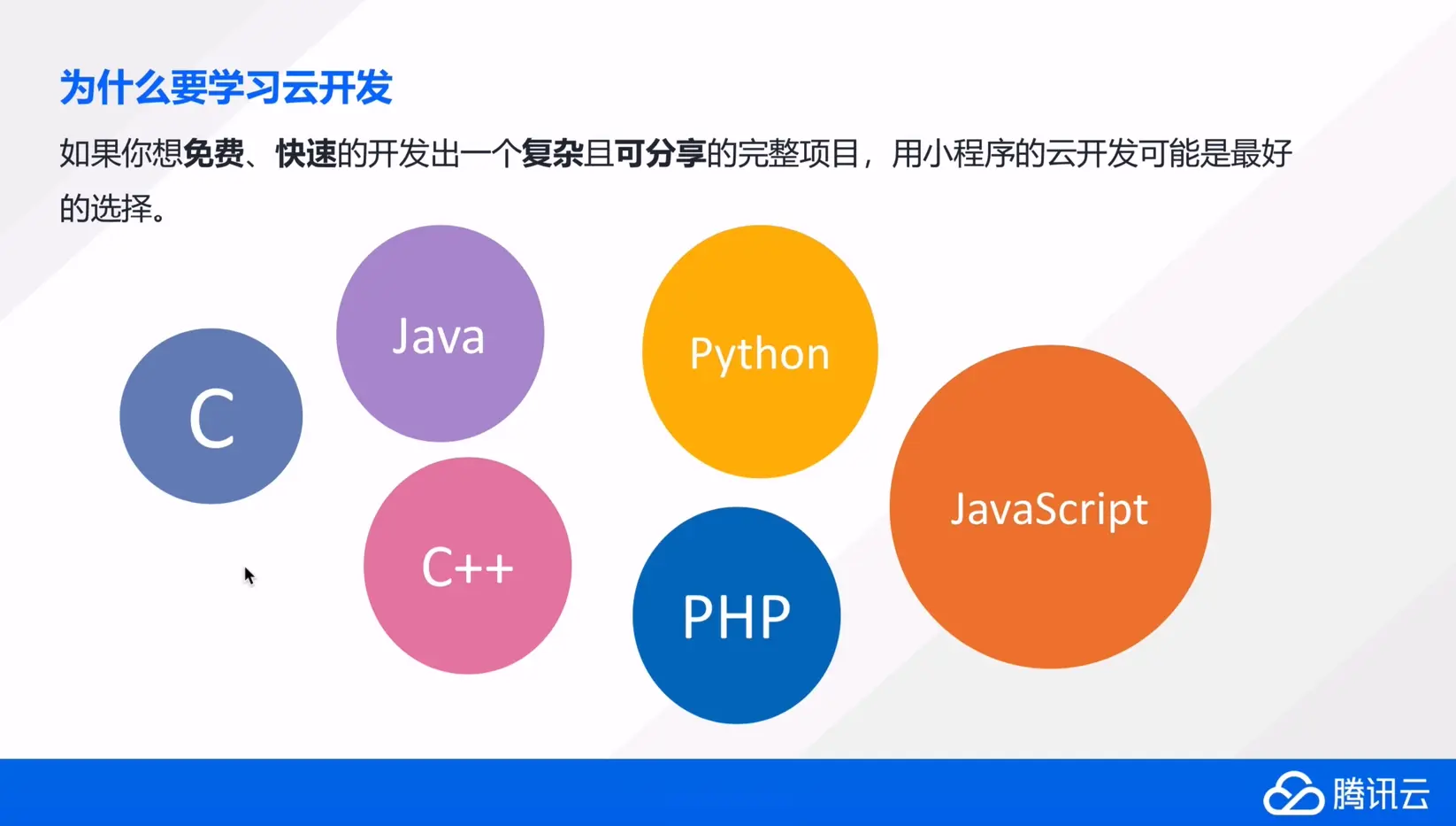 - 开发快速,体现在云开发和小程序所使用的技术栈是一致的,可以提高开发效率。例如我们青岛很多的团队,他们后台往往是用Java、python、php来写的,还有另外一个人来写前端,因为写前端用的JavaScript,这就会导致一个团队至少是两个人来开发。只要是两个人,那就会存在一定的沟通成本,从而导致开发速度下降。但是在云开发当中使用的全是JavaScript,你可以一个人去搞定所有的事情,这样就可以以更快的速度完成产品的迭代和应用开发。