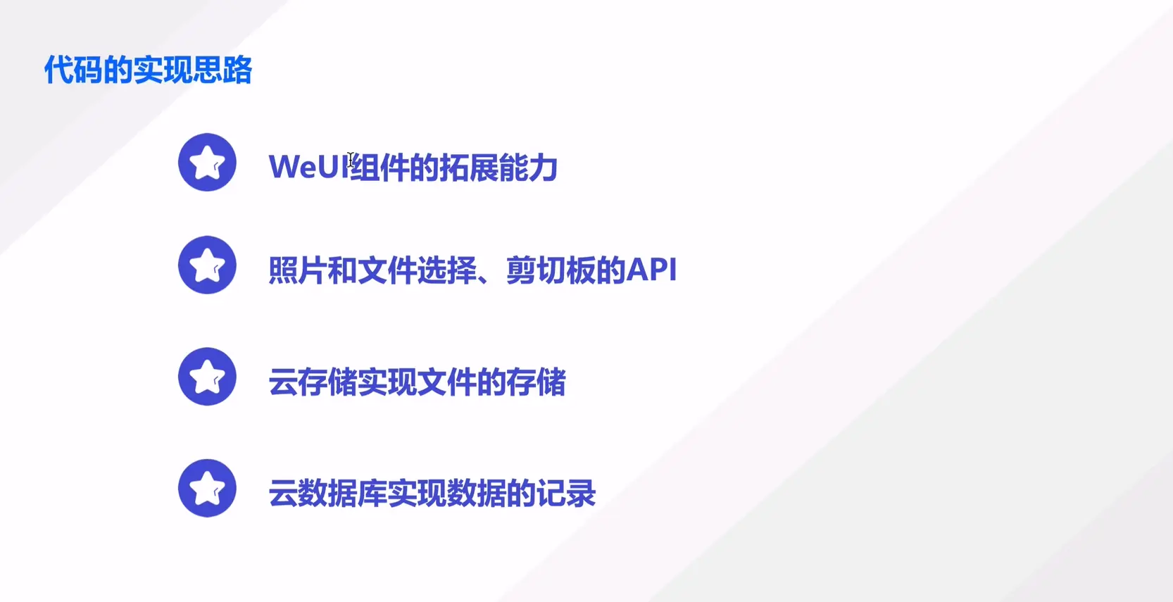 可以看到,在这个应用中,其实用到了很多不同的能力,比如说使用的界面,非常像微信的官方的界面,那么这是因为我们在写代码的时候使用了微信官方所提供的这样的一个WeUI组件以及其对应的扩展能力。其次,看到在小程序当中实现了照片的选择,以及文件的选择,还将生成的一个链接复制到了剪贴板中,这些都是调用了小程序的相关api。还实现使用云存储来存储文件,使用云数据库存储数据记录,那么这样就完成了我们想要的网盘的功能。