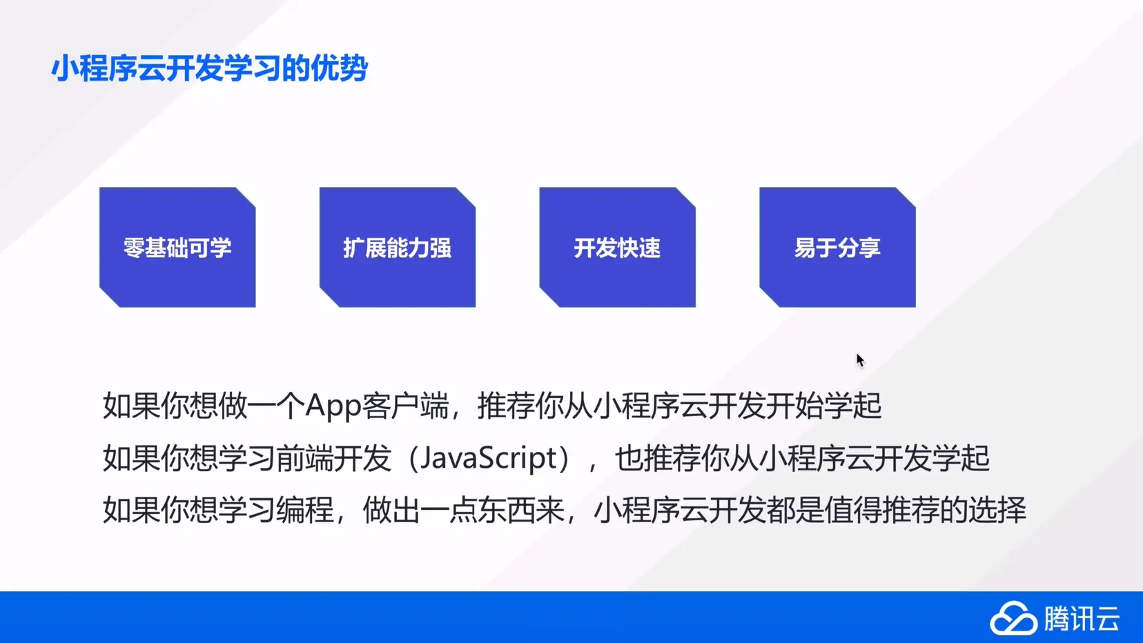 - 零基础可学。小程序云发走的还是小程序的技术栈,相对来说不如所谓的现代的这样的一些前端开发体系、后台开发体系复杂,是以简化的一个方案,学起来很简单。