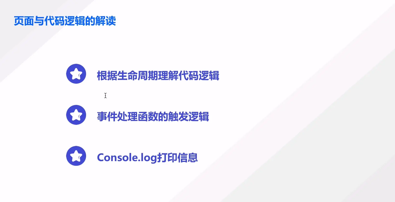 具体看一看代码是怎么实现的。在正式学代码之前,先要学如何去看代码。首先需要了解生命周期,看代码时候,要先了解代码它的生命周期是什么,并且跟着生命周期的节奏去一点点去看代码是什么样的。除了生命周期以外,在界面当中涉及到不同的按钮,我们也可以通过这个按钮来去追查逻辑是如何实现的,比如说点击按钮,会触发什么样的事件,点击目录,会触发什么事件,那么根据这些也可以学到一些代码。在进行使用的时候,要注意多使用console.log来去将我们的信息打印出来,这样可以看到不同时间段我们的数据是如何变化的,可以更加有效地帮助你去理解业务逻辑。