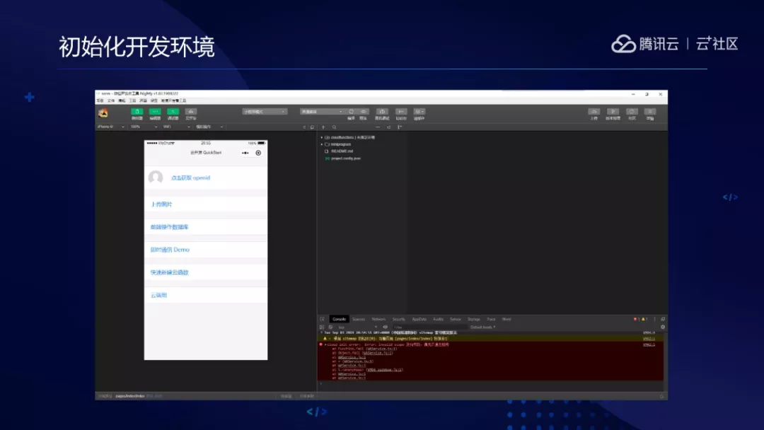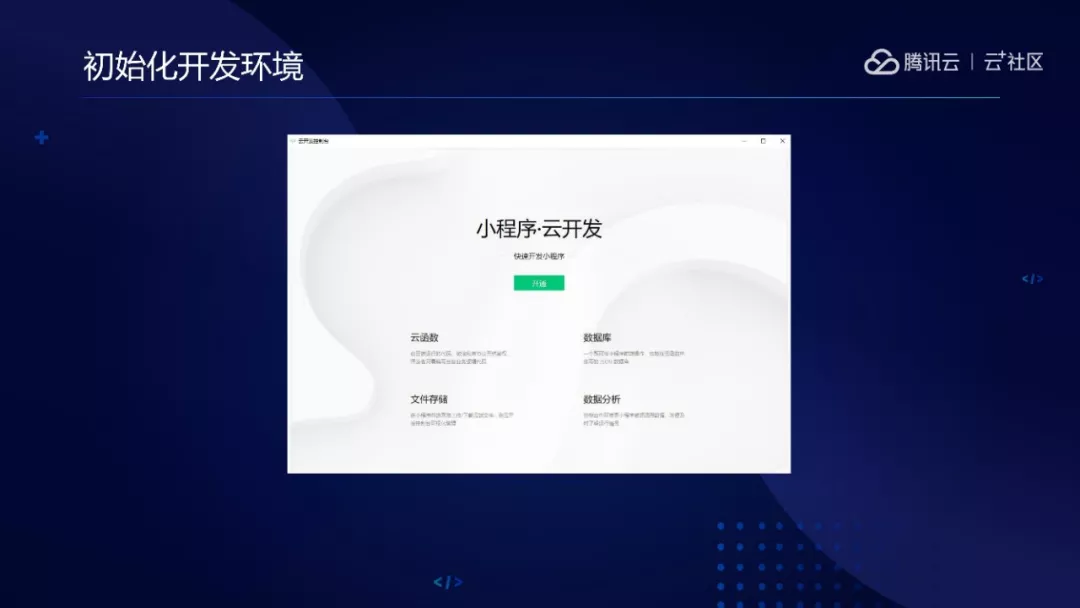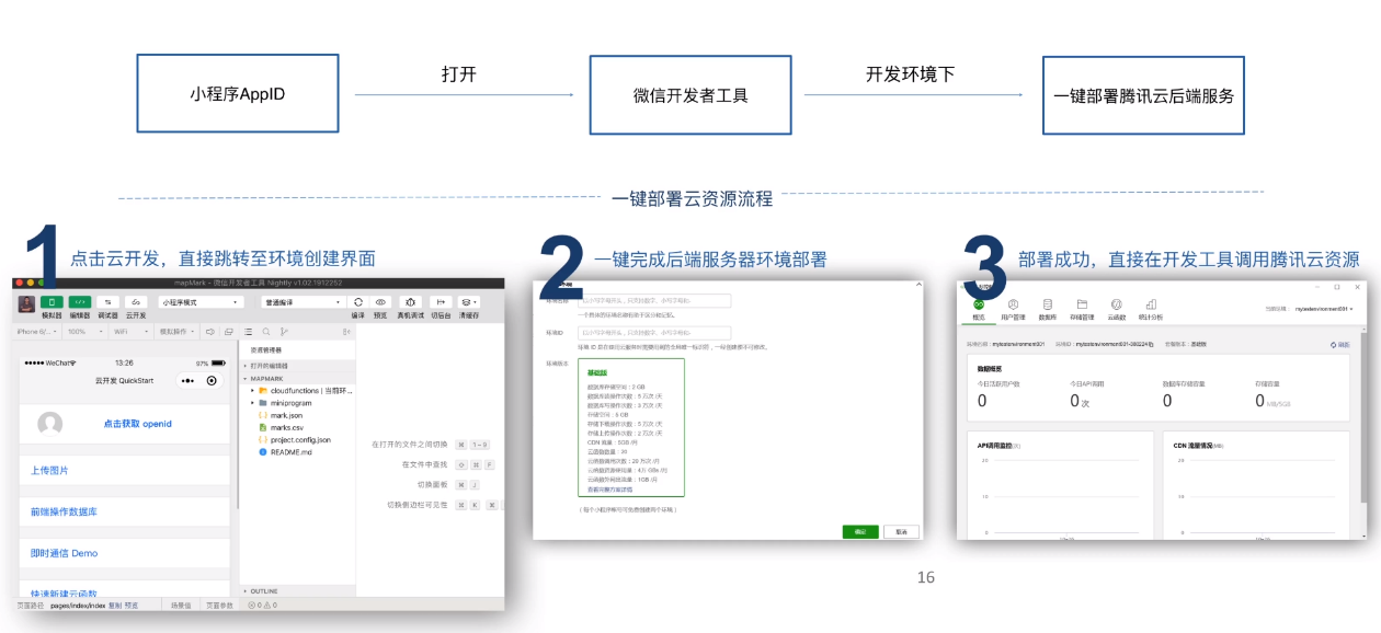 小程序云开发是经典的serverless的实现,小程序端提供了完善的组件库和开发工具,开发者可以聚焦自己的业务实现。云端提供了基于MongoDB的数据库、对象存储和云函数,以及运维工具等功能。这样一来,整个开发、部署、运维就可以全部一站式完成,借助于微信和腾讯云强大的功能帮我们节省了大量的时间,节省了大量的钱,这就是它的本质。云端有运营分析的界面,当一款小程序上线之后就可以在运营分析界面上看到用户量和资源使用的情况,包括监控的图表都可以看到。