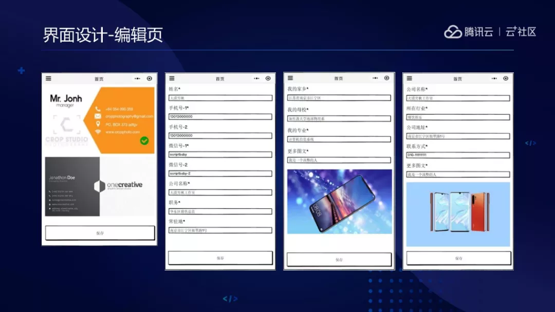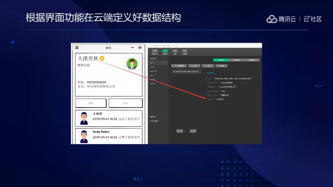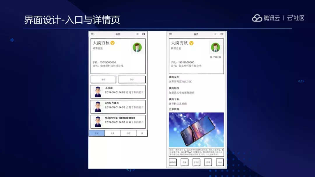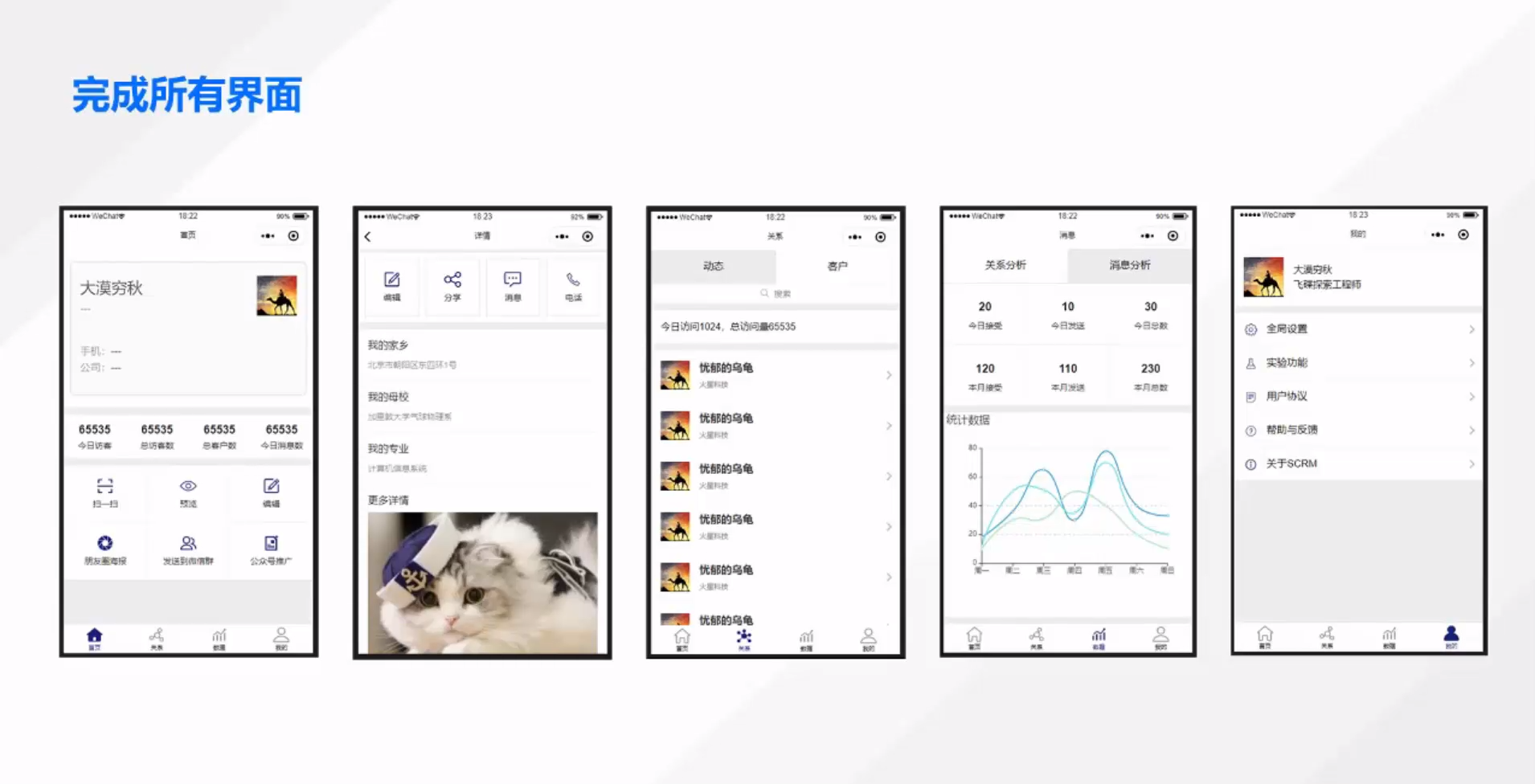 还有基本的客户关系的维护、沟通交流的渠道,比如说可以跟客户发消息、打电话等等场景。同时还可以有一些图表统计界面,告诉我现在有多少客户,我和客户之间的关系是一种什么样的结构。下面这些是设计草图,我们没有办法拿到很详细地人际关系链,人际关系链是微信的核心资产,我们最多拿到一些子图(Subgraph)。大概一共有30个页面需要实现,得到界面之后就可以来定义云端的数据结构和云函数了。