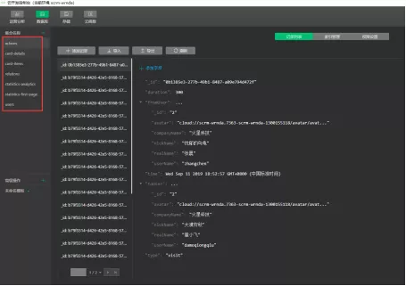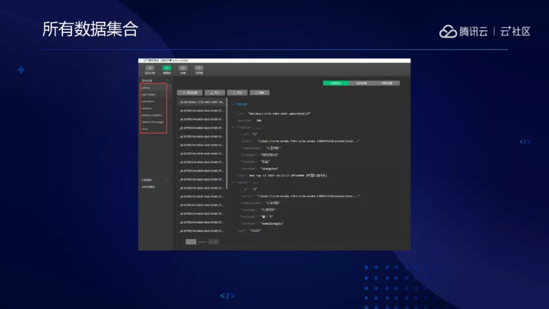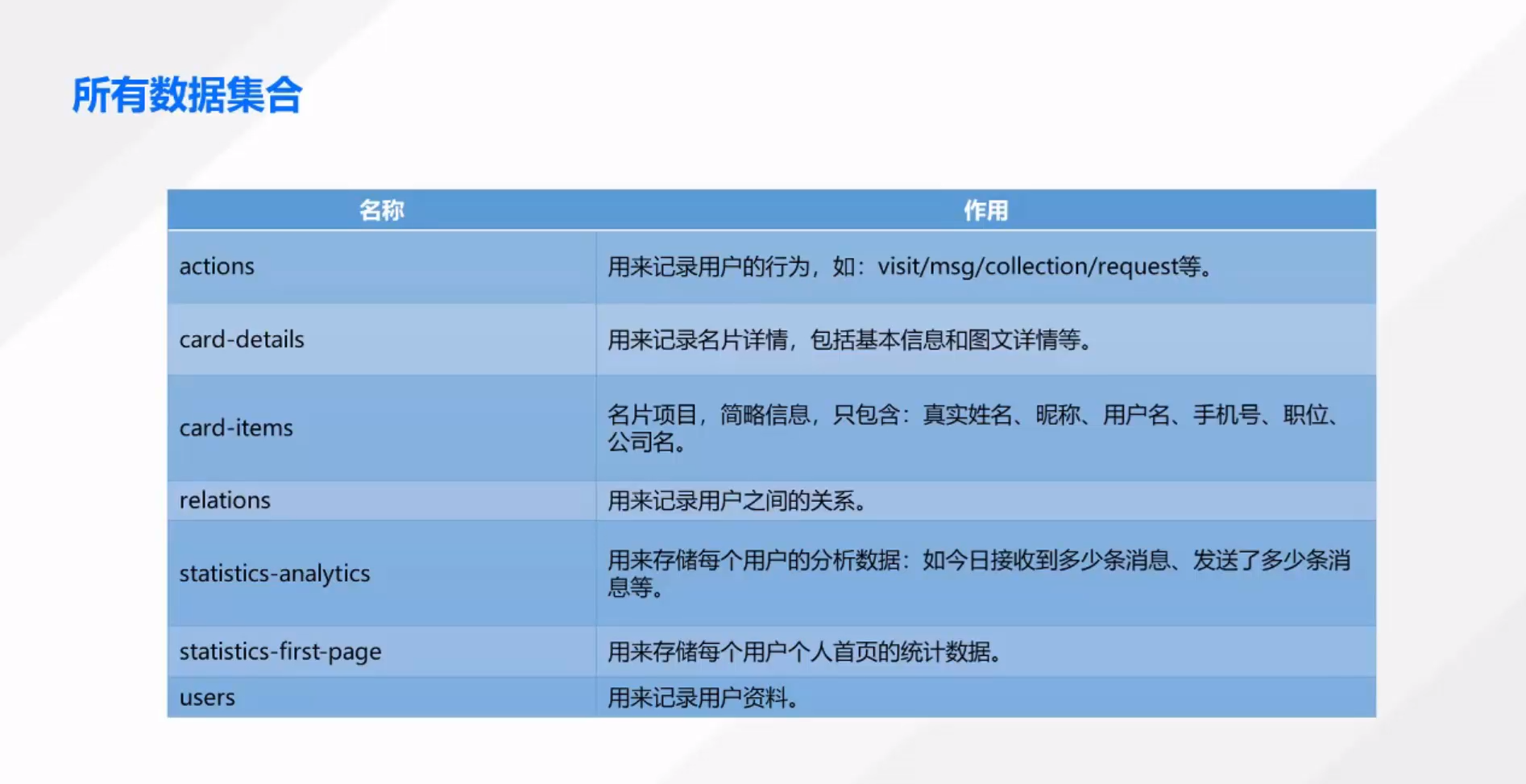 小程序的数据库背后实际上是MongoDB,“客流”这个小程序一共定义了7个集合,集合的概念类似于关系性数据库里的一张表,我们所有的数据都放在不同的集合里。