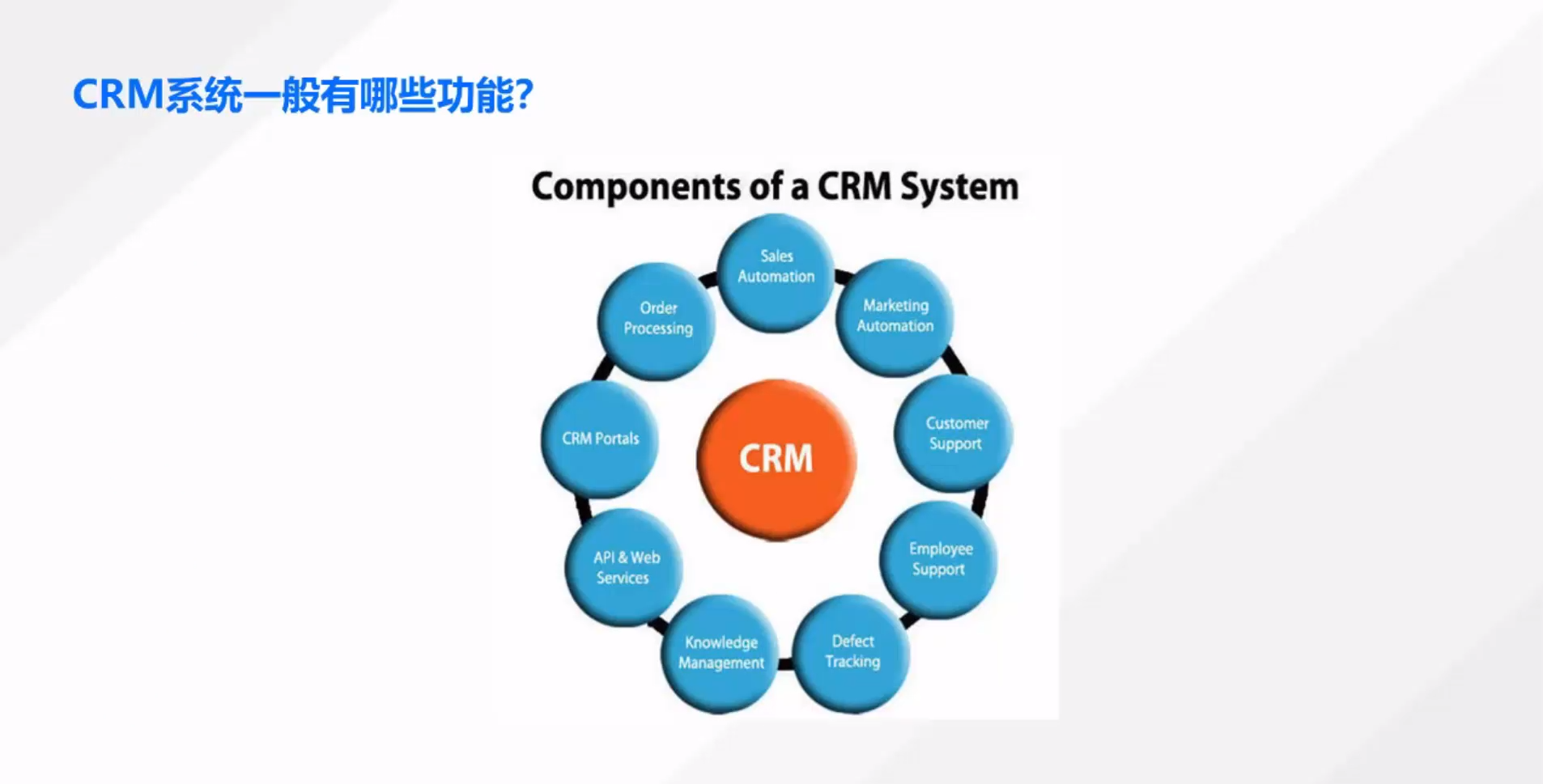 CRM是一个很大的概念,这种系统一般会有很多功能,比如说sales、marketing、customer、employee support等等,下面是大概的结构图。
