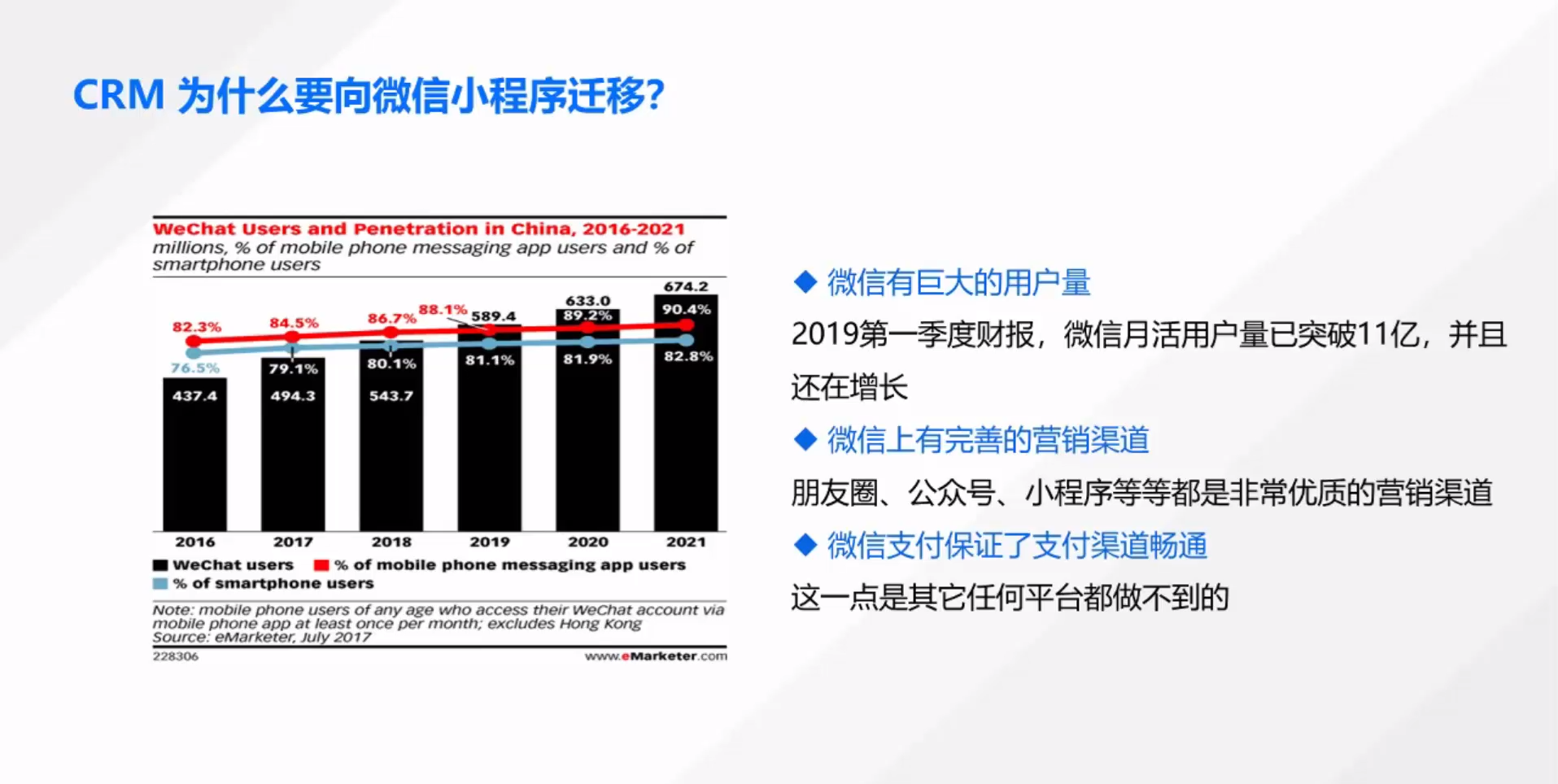 有人会问,既然我们在桌面端已经有了这么庞大的CRM系统,为什么现在要向微信小程序上做迁移呢?典型的几个原因如下: