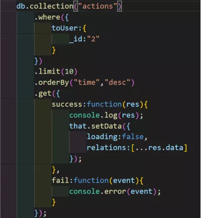 - 我们再看怎么进行前后端的数据交互,比如说列表页和云函数是怎么用的。 在关系页面上只要用wx.cloud.database就可以拿到db对象,整个过程和以前操作关系的数据库还是比较类似的。在操作关系数据库的时候一般会拿一个connection对象,然后就可以用SQL进行数据库操作,做完这些操作之后可以提交事务或者回滚。 在云开发这里,你需要拿到一个db对象,然后利用db对象所提供的API进行数据库操作。你要搜索哪个集合,你告诉它集合的名称。下面的语法很好了解,提供一个where条件,限定取多少行,也可以orderby,提供这些语法之后就可以get到数据,提交一些函数如果成功怎么样,失败怎么样。这是操作数据库的方式。 操作云函数的方式也是类似的,它有对应的API,只要调用就行了。