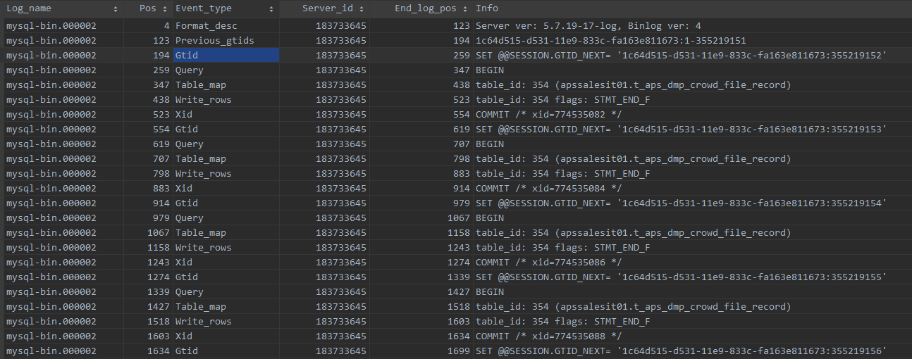 SHOW BINLOG EVENTS IN 'mysql-bin.000002'