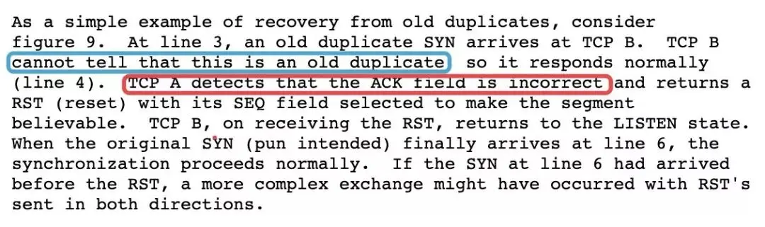 确实说明了TCP B不能检测这个旧的SYN 报文是否正确,所以正常返回。而客户端收到会进行检测,发现是旧的报文,就会返回RST 报文。